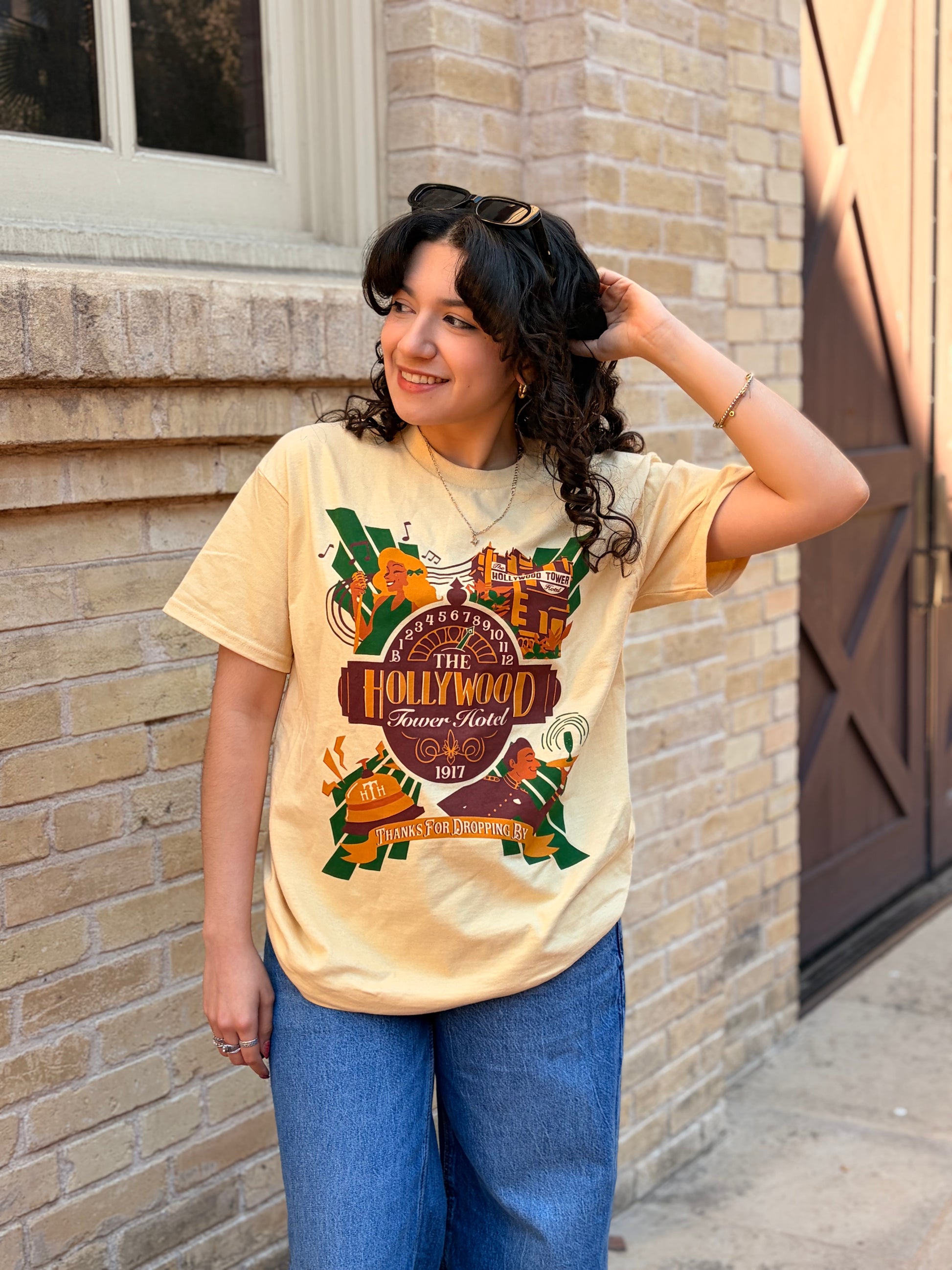 Welcome to the Hollywood Tower Hotel! This Tower of Terror-inspired shirt combines the old Hollywood art deco style feel with the ominous feeling you might be dropping by after check-in. This tee is perfect for Disney fans who love this spooky thrill ride or would prefer a stroll down Hollywood Boulevard. We hope this shirt will be a pleasant one!